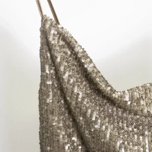 Payet detaylarıyla geceye ışıltı katarken, degaje yaka kesimiyle zarif bir dokunuş sunan bu üst, stil oyununu baştan yazıyor.